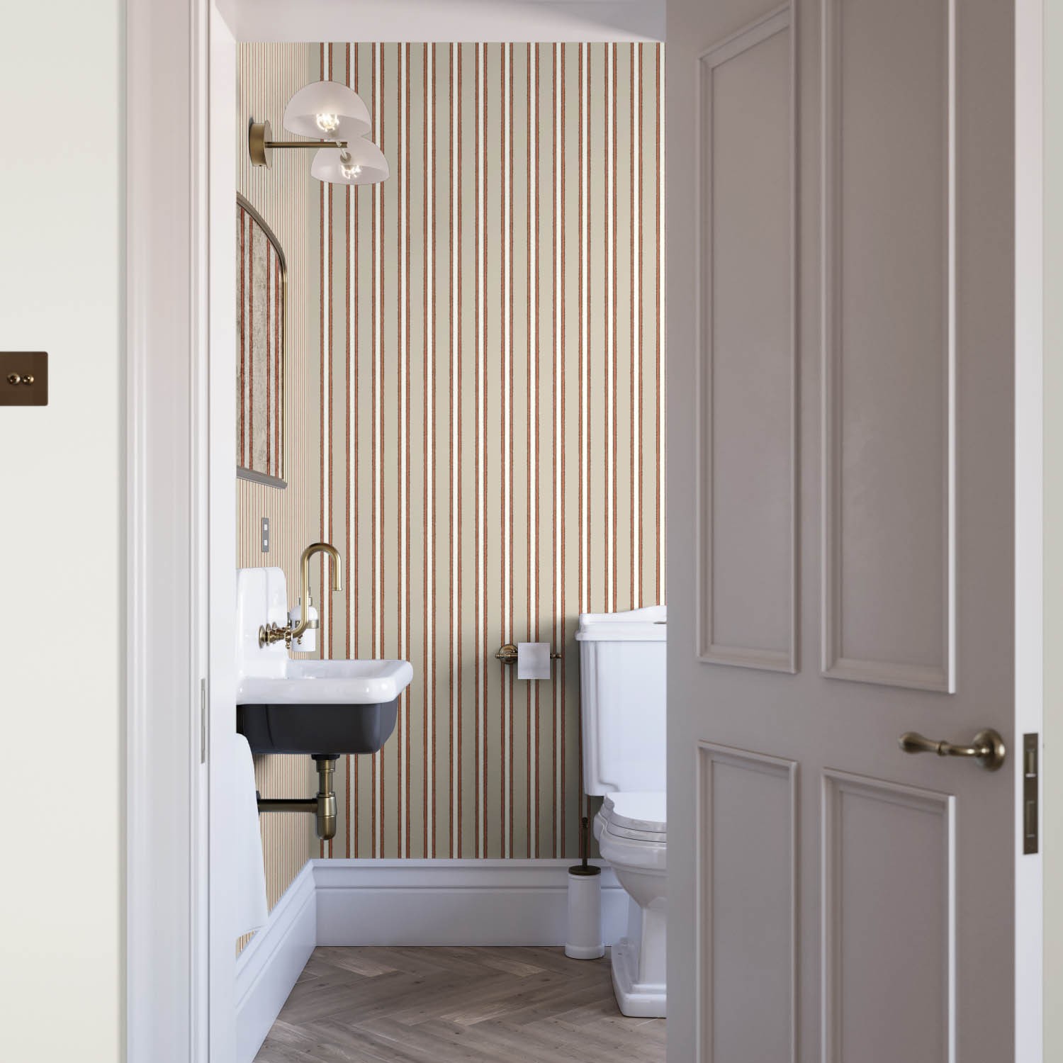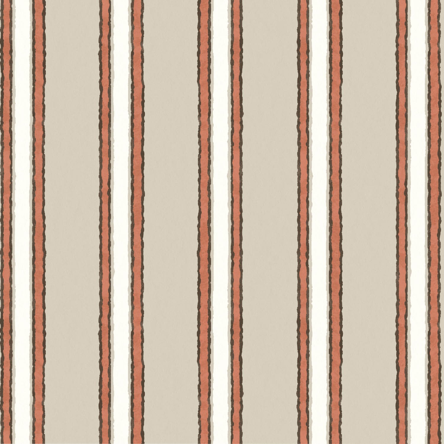 Seen here in taupe with striking red and white accents, this hand-painted stripe is a perfect coordinate. Available in seven usable colourways, this small-scale line is perfect for soft furnishings and drapery.