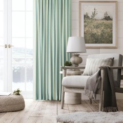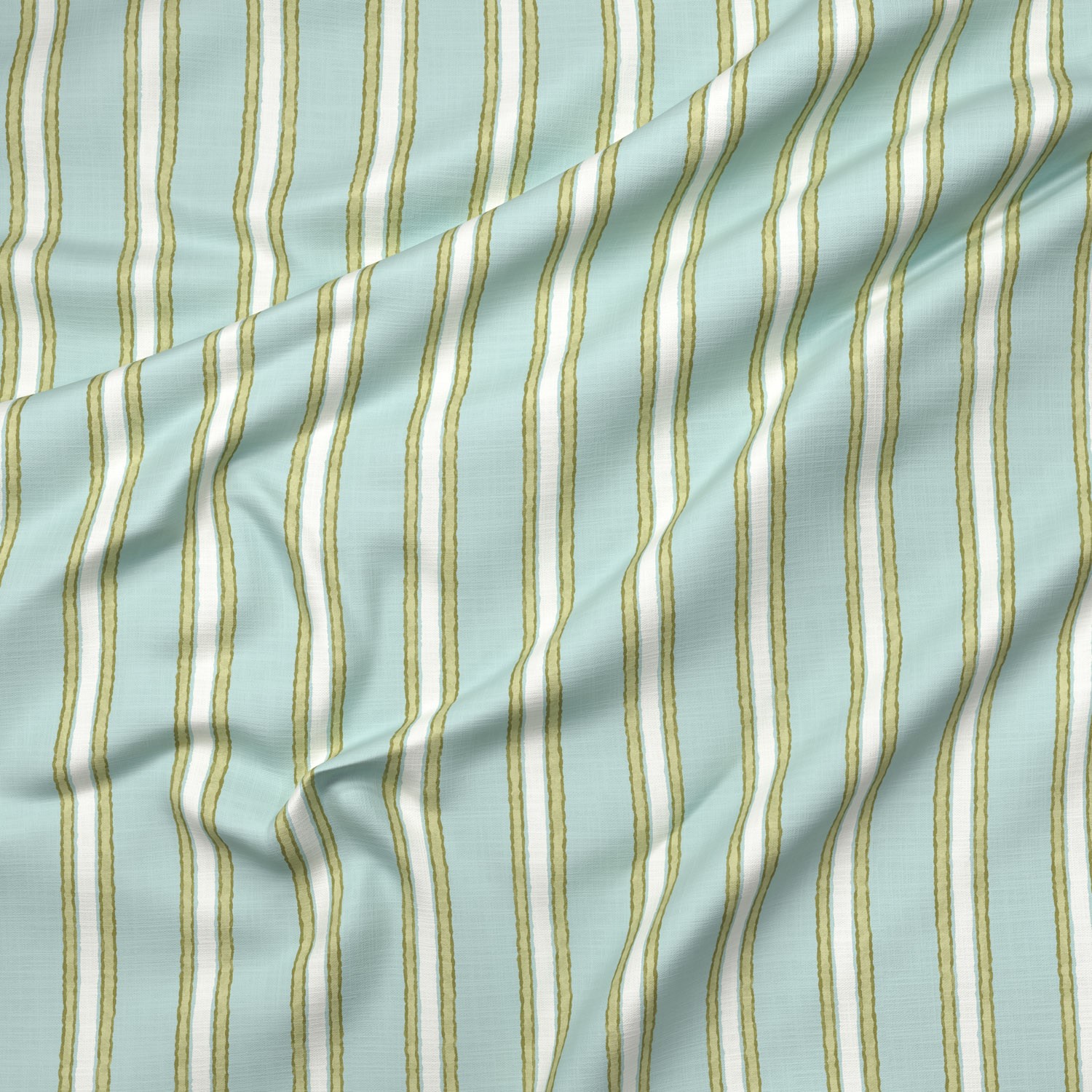 Seen here in a pale teal with fresh green and white accents, this hand painted stripe is a perfect co-ordinate. Available in seven usable colourways and produced on a 100% organic cotton cloth, this small-scale line is perfect for soft furnishings and drapery.