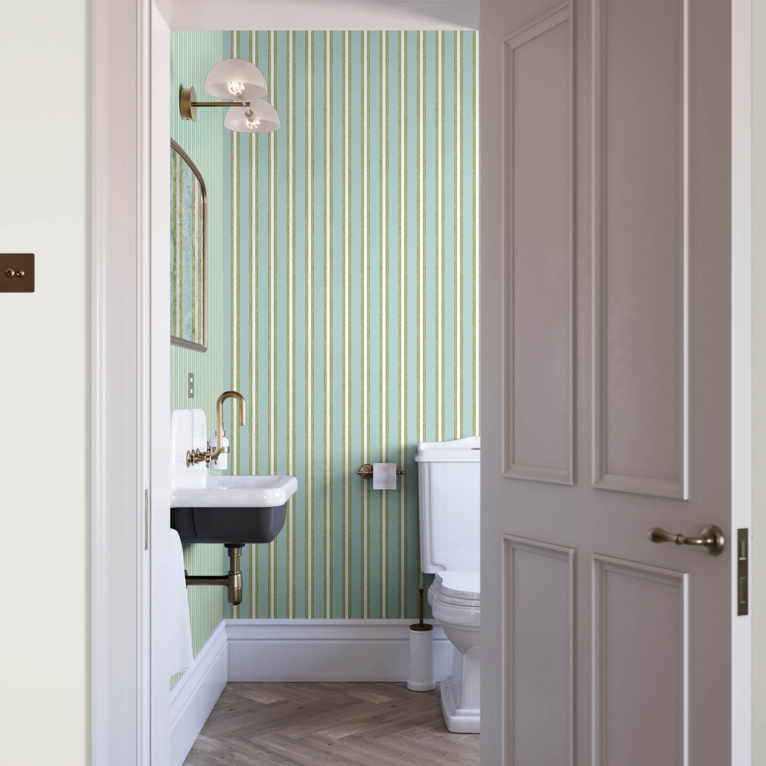 Seen here in a pale teal with fresh green and white accents, this hand-painted stripe is a perfect coordinate. Available in seven usable colourways, this small-scale line is perfect for soft furnishings and drapery.