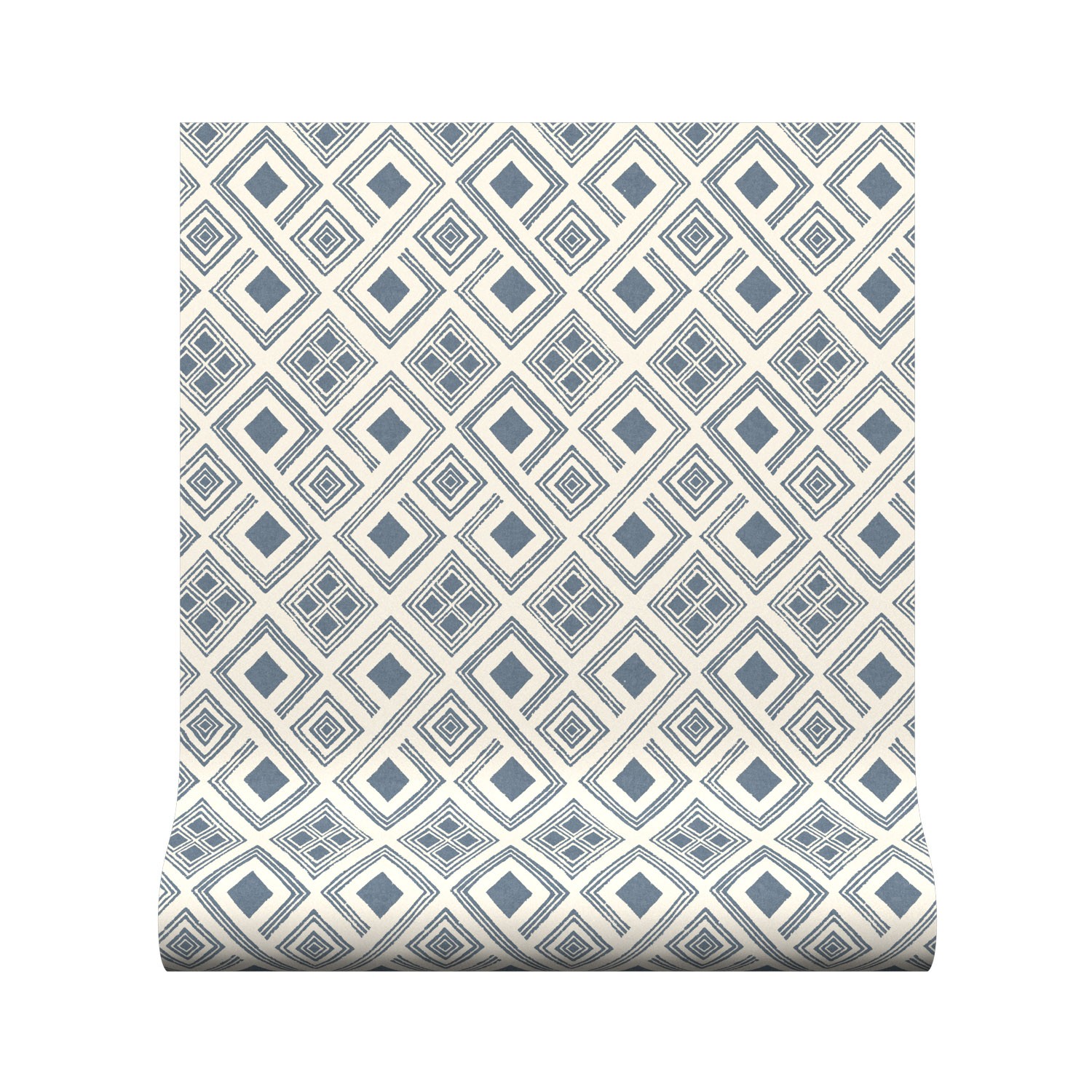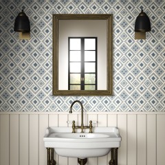 This diamond geometric wallpaper has a hand block printed look reminiscent of mosaic tiles and comes in six colourways including the inky blue shown here.