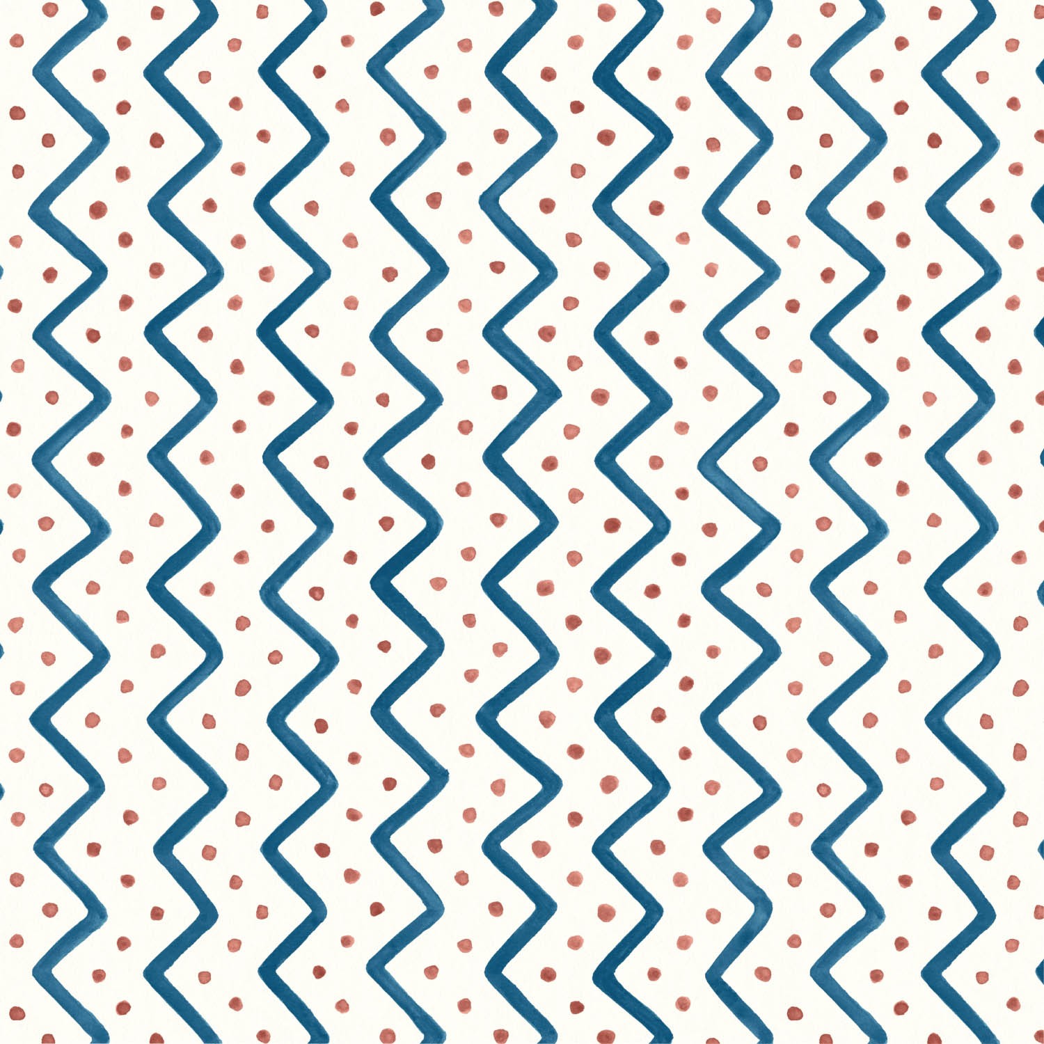 Adapted in our studio from a section of a historical French chintz, this fun print features a repeating, inky blue zig zag and contrasting red dots. Whimsical and easy-to-use, this small-scale wallpaper is available in nine other versatile colourways.