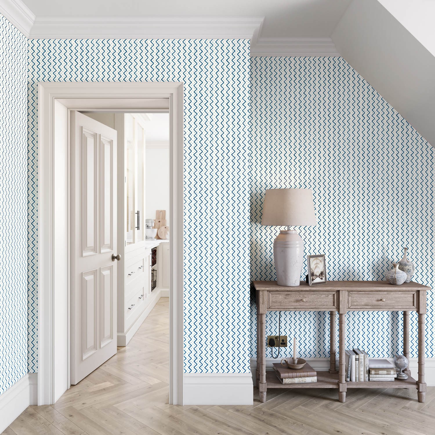 Adapted in our studio from a section of a historical French chintz, this fun print features a repeating, deep blue zig zag and pale blue dots. Whimsical and easy-to-use, this small-scale wallpaper is available in nine other versatile colourways.