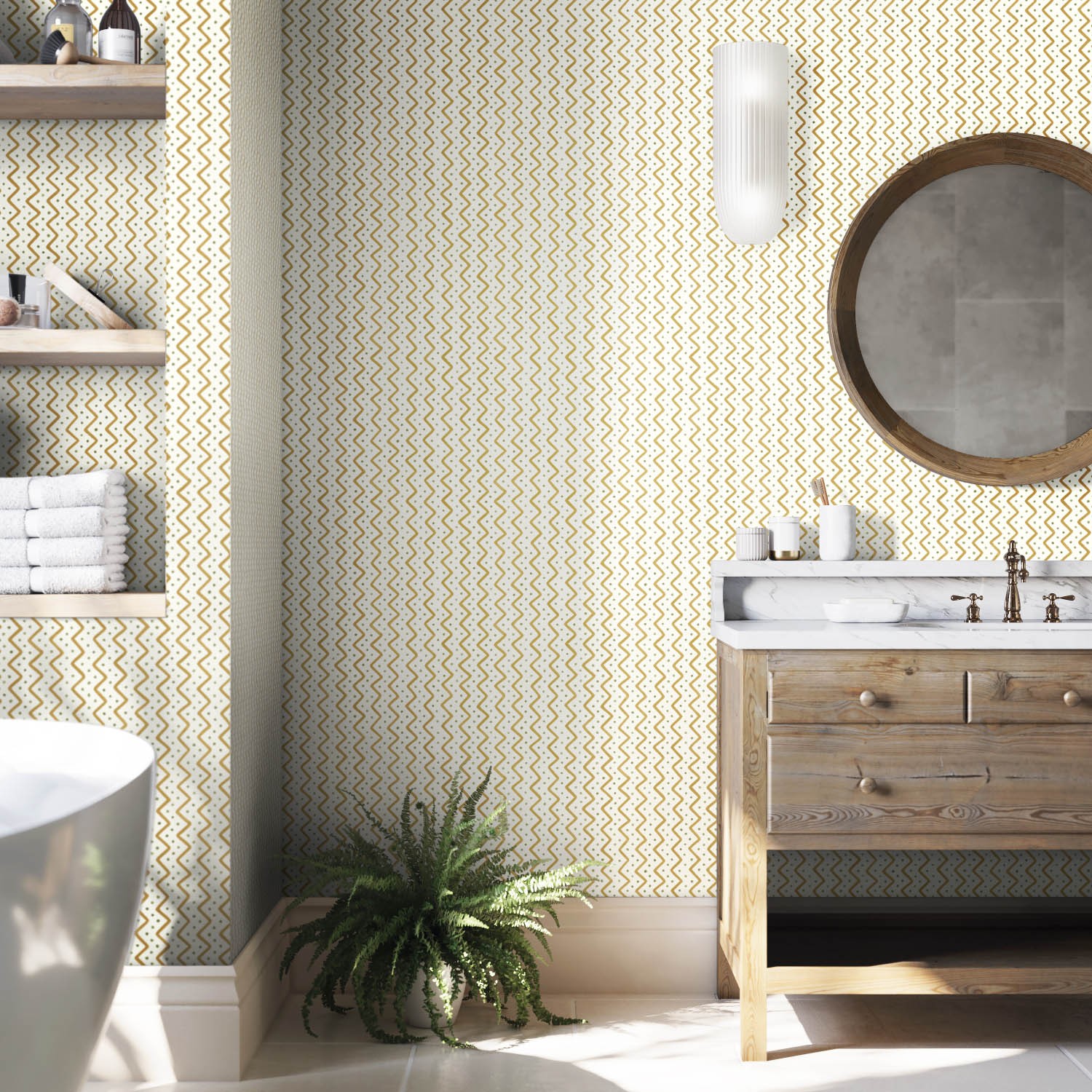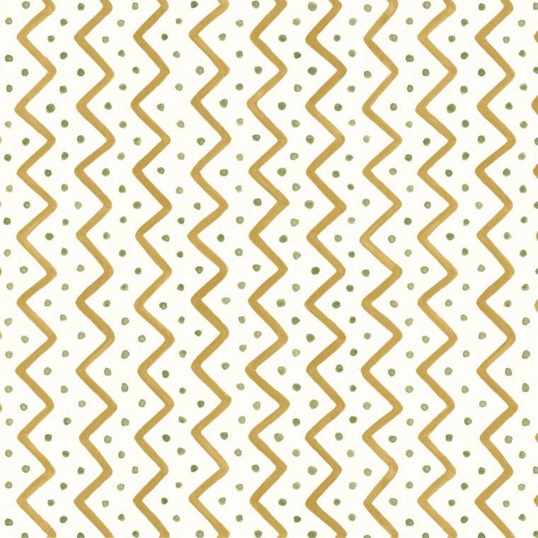 Adapted in our studio from a section of a historical French chintz, this fun print features a repeating, golden zig zag and sage green dots. Whimsical and easy-to-use, this small-scale wallpaper is available in nine other versatile colourways.