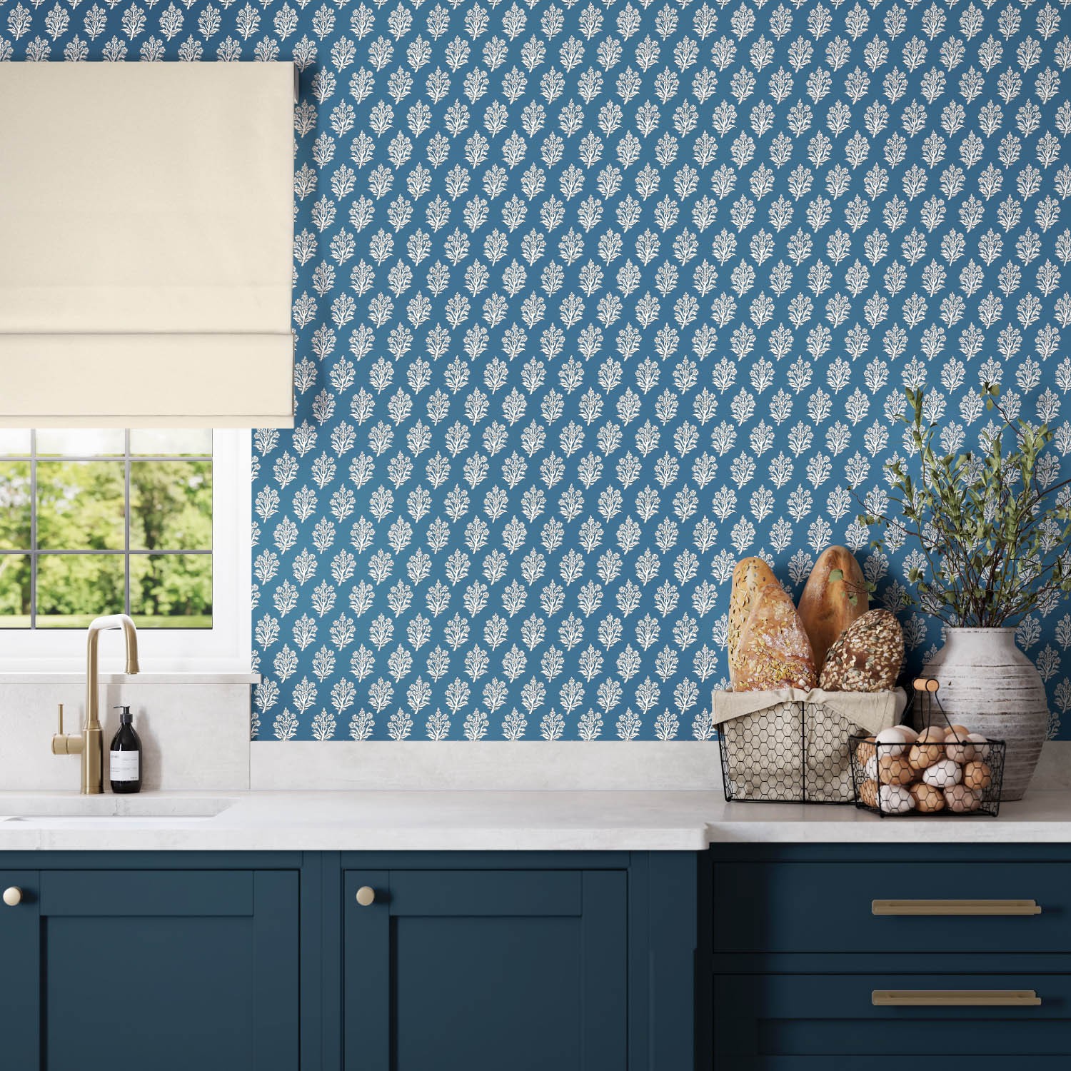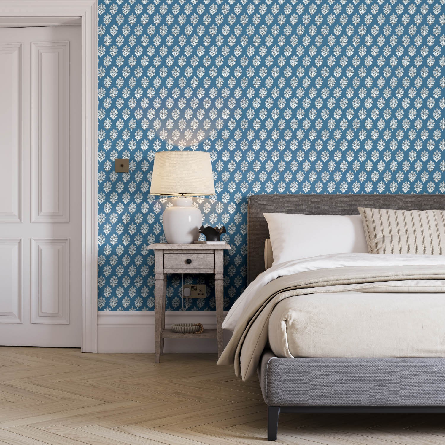 Seeking inspiration from Indian hand block prints, this charming floral motif is chic and versatile, printed in deep ink blue. This small-scale wallpaper design is available in nine other colourways.