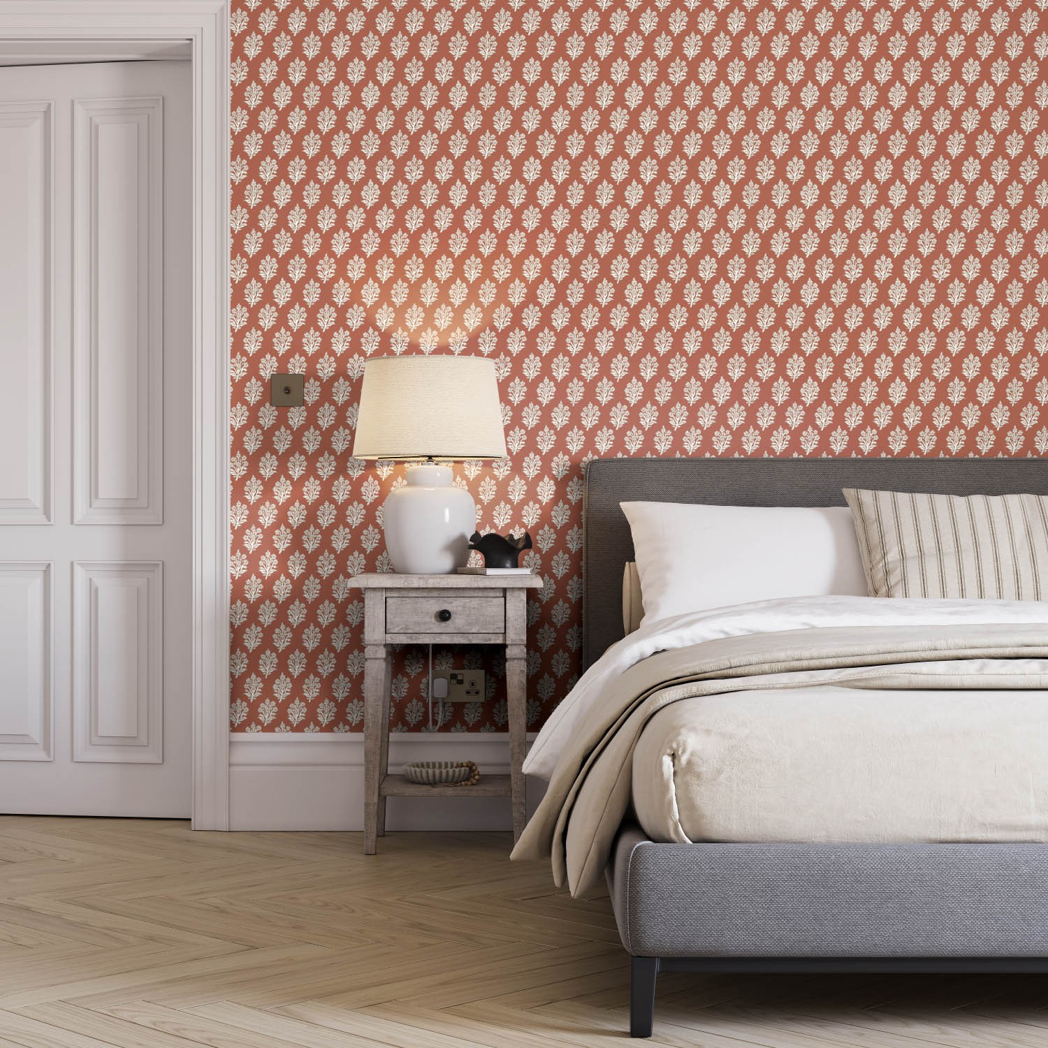 Seeking inspiration from Indian hand block prints, this charming floral motif is chic and versatile, printed in a deep, brick red. This small-scale wallpaper design is available in nine other colourways.