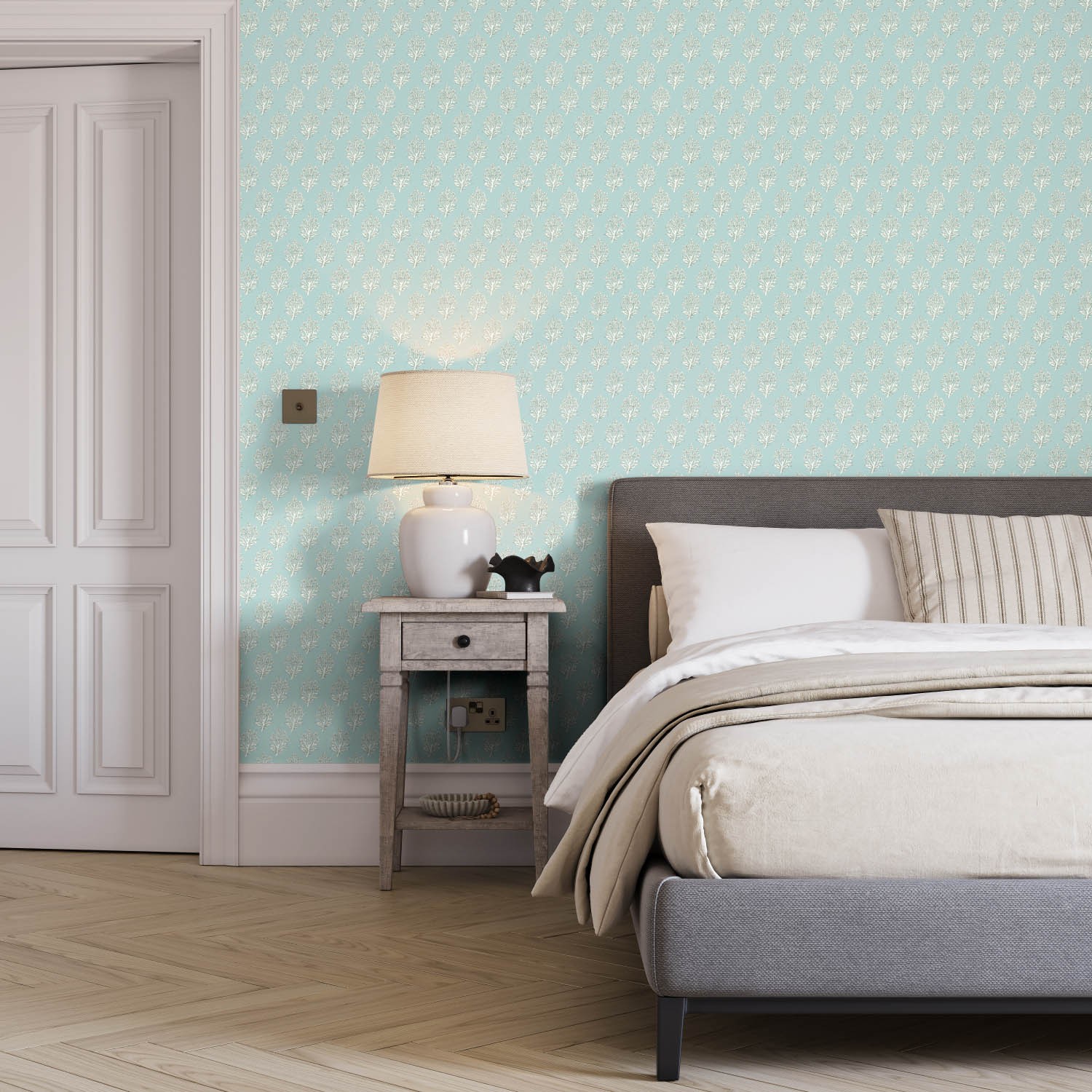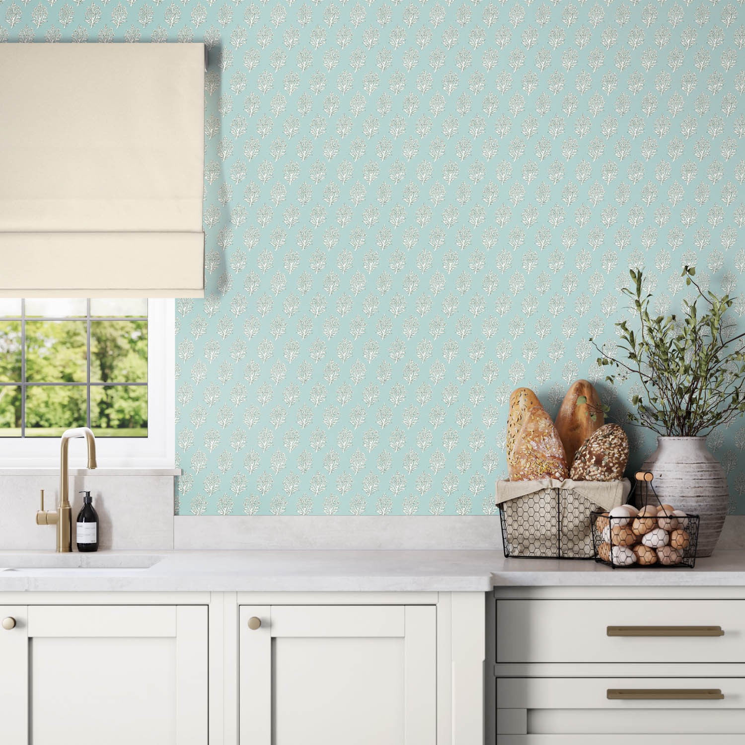 Seeking inspiration from Indian hand block prints, this charming floral motif is chic and versatile, printed in a pale teal colourway. This small-scale wallpaper design is available in nine other colourways.