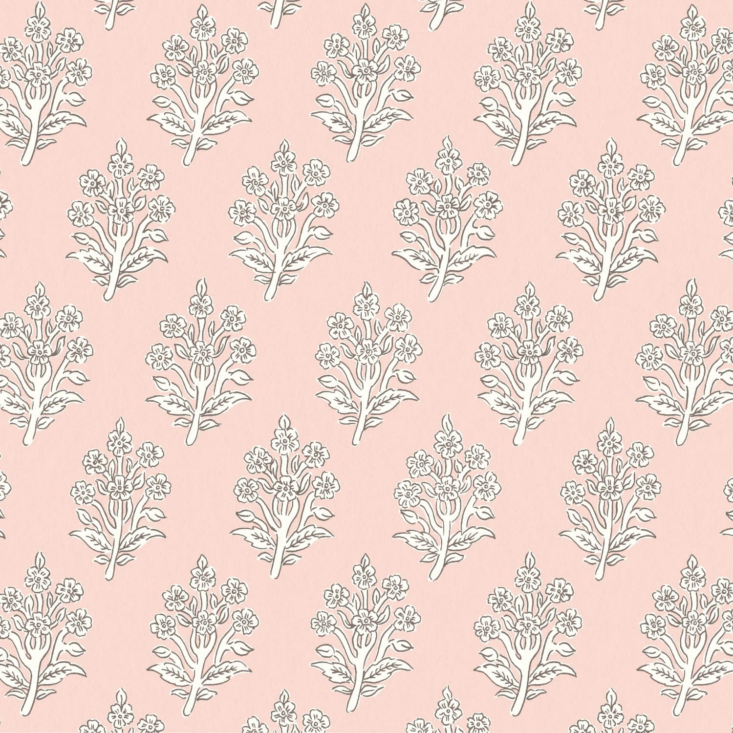 Seeking inspiration from Indian hand block prints, this charming floral motif is chic and versatile, printed in a blush pink colourway. This small-scale wallpaper design is available in nine other colourways.