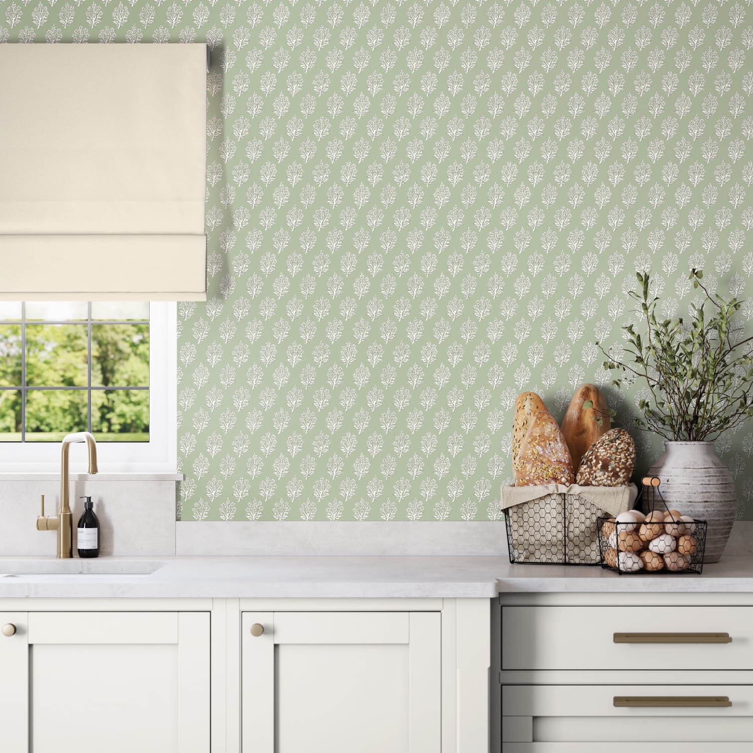 Seeking inspiration from Indian hand block prints, this charming floral motif is chic and versatile, printed in a muted green colourway. This small-scale wallpaper design is available in nine other colourways.