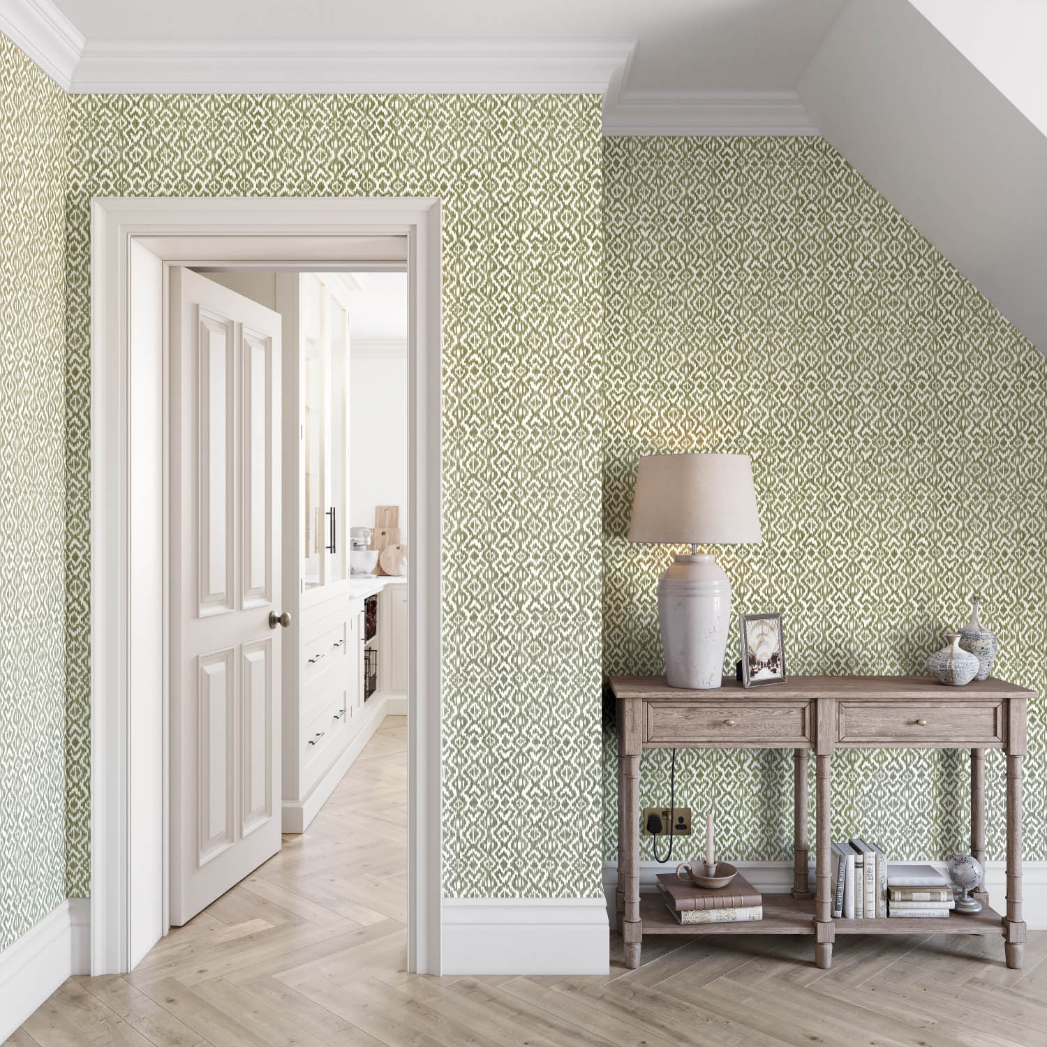 Originating from Persia, and shown here in its deep olive green colourway, this small-scale ikat design makes a perfect coordinate. This stylish wallpaper design is available in eight other colourways.