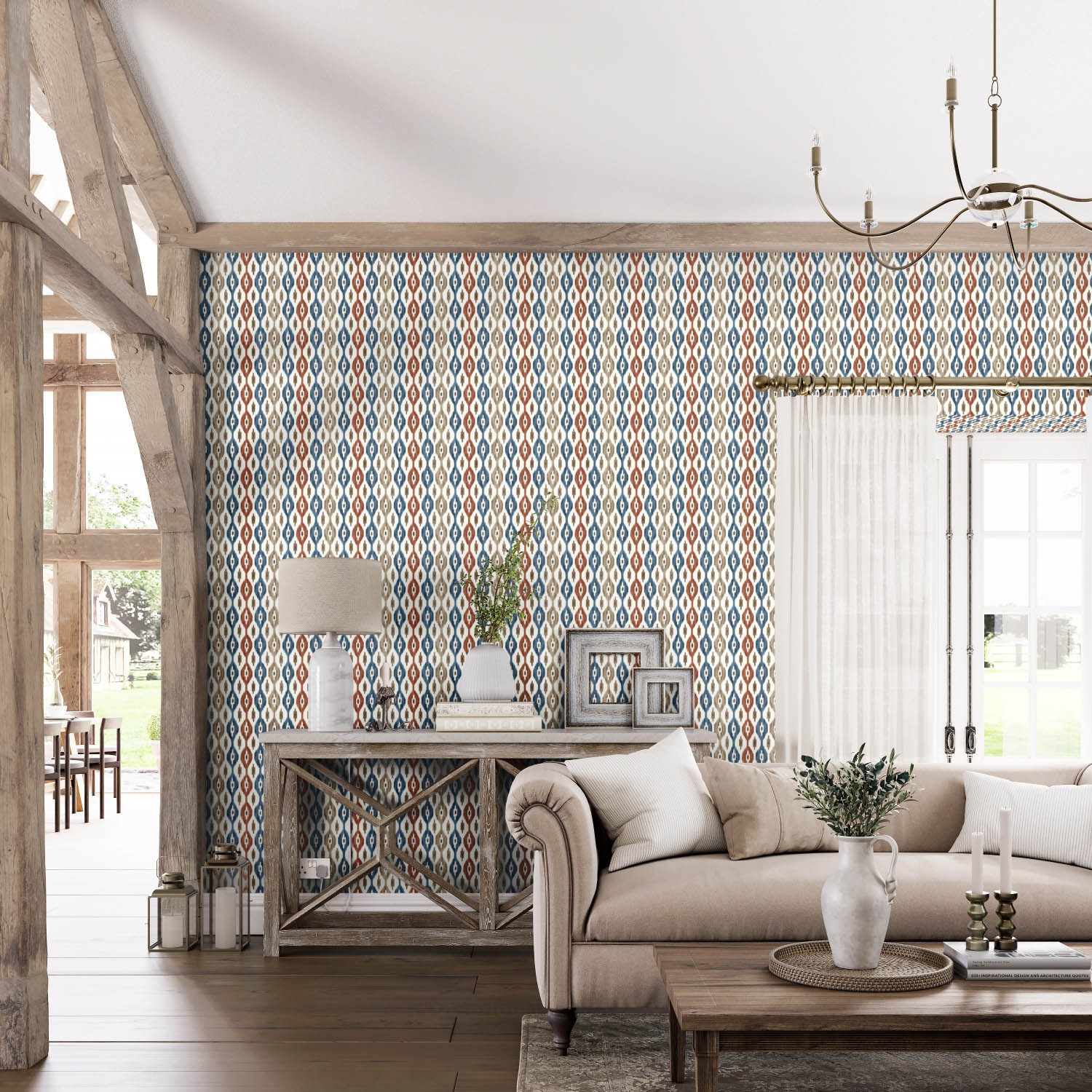 Shown here in varying shades of deep blue, earthy red, and taupe, this contemporary ogee stripe is inspired by the ikat silks of Uzbekistan. This versatile wallpaper design has a beautifully soft handle and is printed in four further colourways.