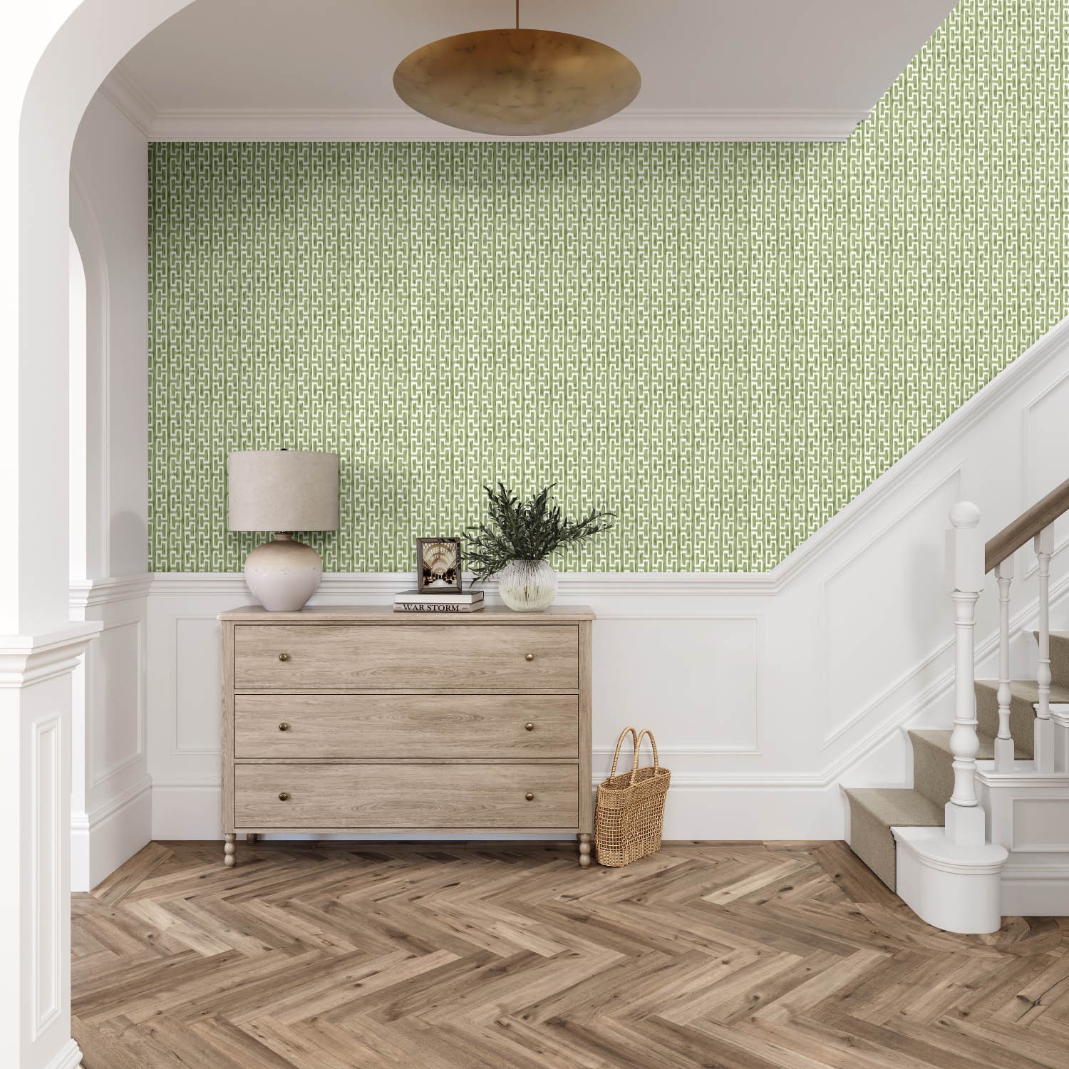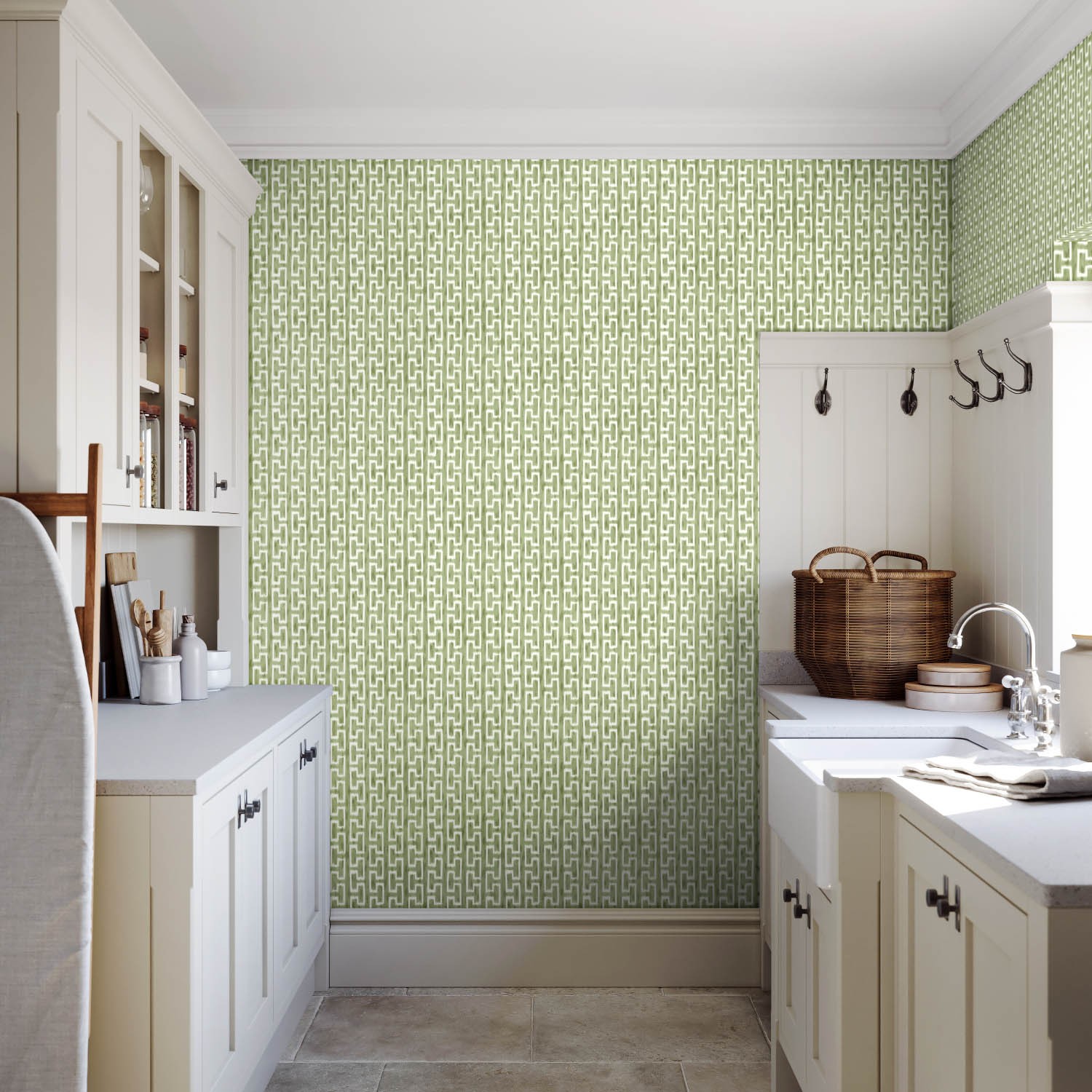 This small-scale geometric wallpaper design is seriously stylish, featured here in a fresh, spring green. Created from an 1878 French document, it seeks inspiration from Azerbaijan textile weaves. This chic pattern is available in eight further colourways.