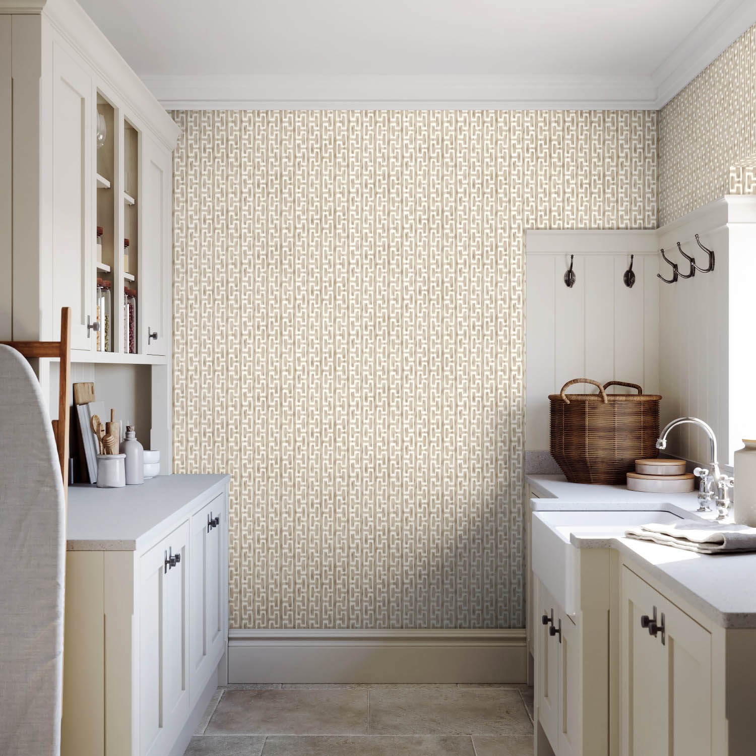 This small-scale geometric wallpaper design is seriously stylish, featured here in a warm neutral shade. Created from an 1878 French document, it seeks inspiration from Azerbaijan textile weaves. This chic pattern is available in eight further colourways.