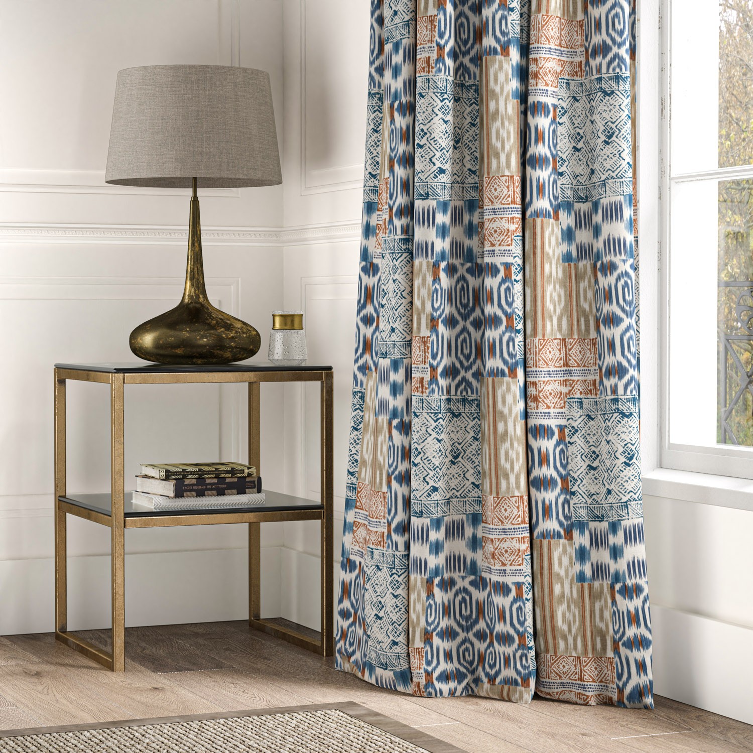 Ikat and geometric tile patterns combine in rich shades of spice and indigo. Originally inspired by a vintage patchwork quilt and printed on responsibly sourced cotton. Team with Odisha, Ellora and Patola.