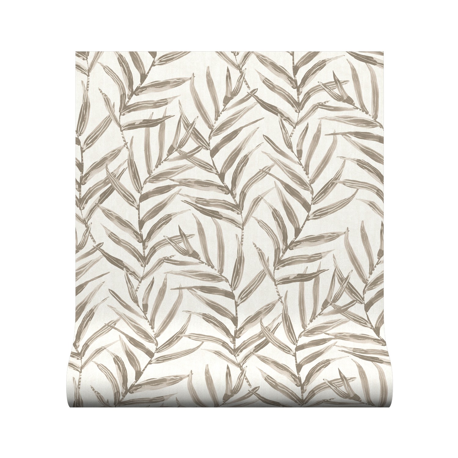 This contemporary interpretation of a bamboo leaf silhouette is hand drawn in watercolour and printed on a plain ground. Restorative, calming and with an easy living feel, this wallpaper is available in three colourways, shown here in a warm taupe shade.