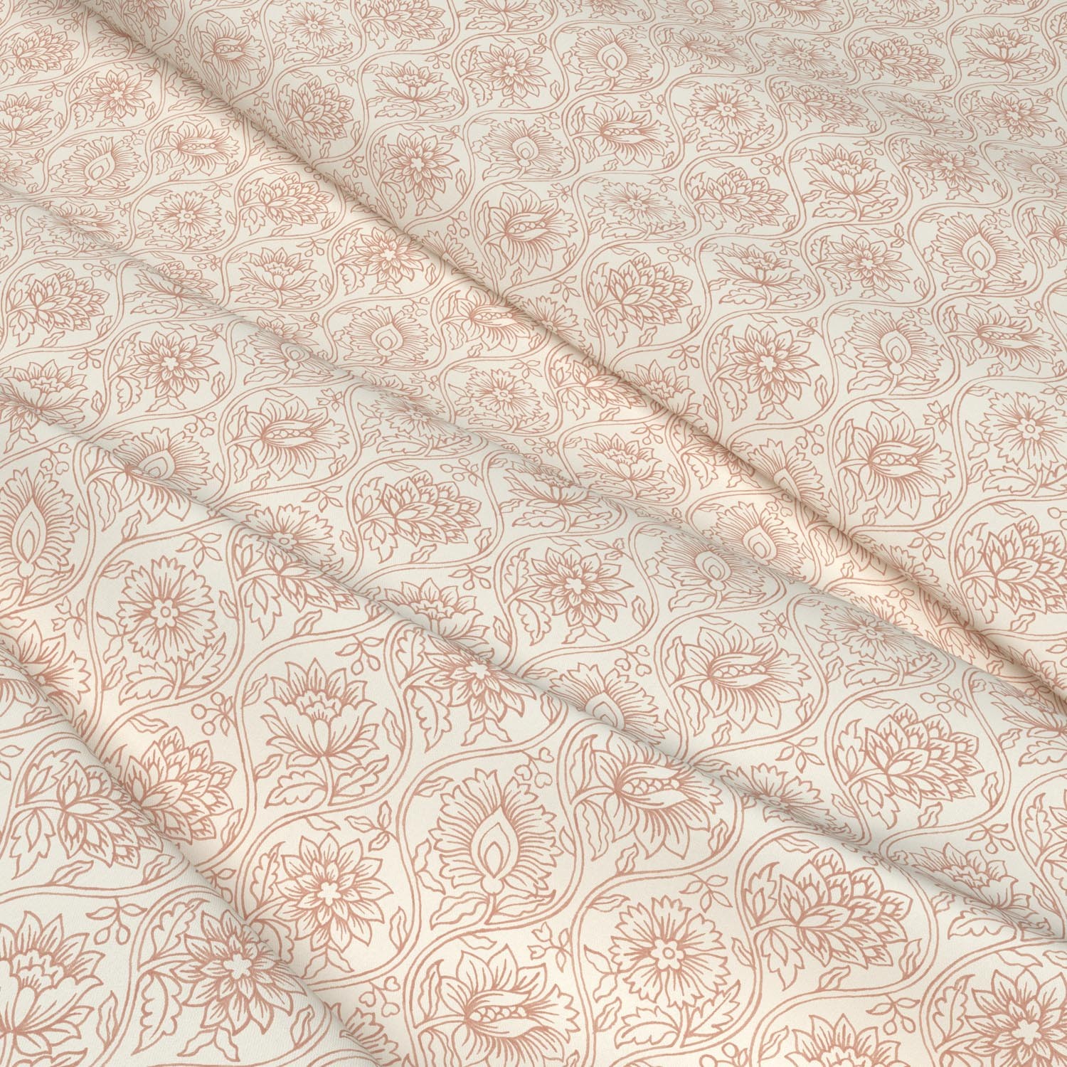 Hand drawn in ink, beautiful dahlia blooms and lotus flowers entwine on an ogee trellis in this fabulous transitional fabric print. Available in a choice of seven colourways including this delicate pink, Lotus is printed on responsibly sourced cotton for a luxurious feel.