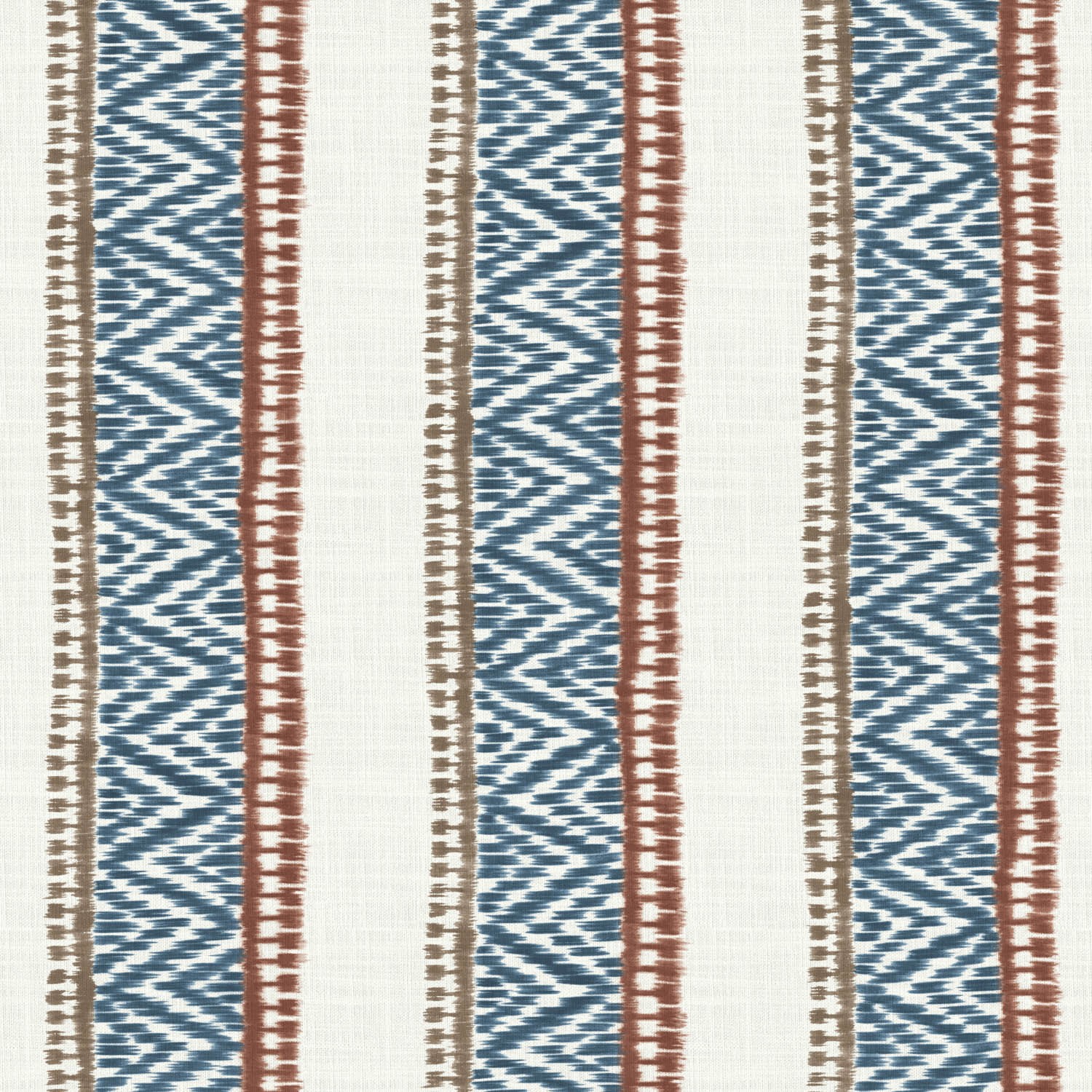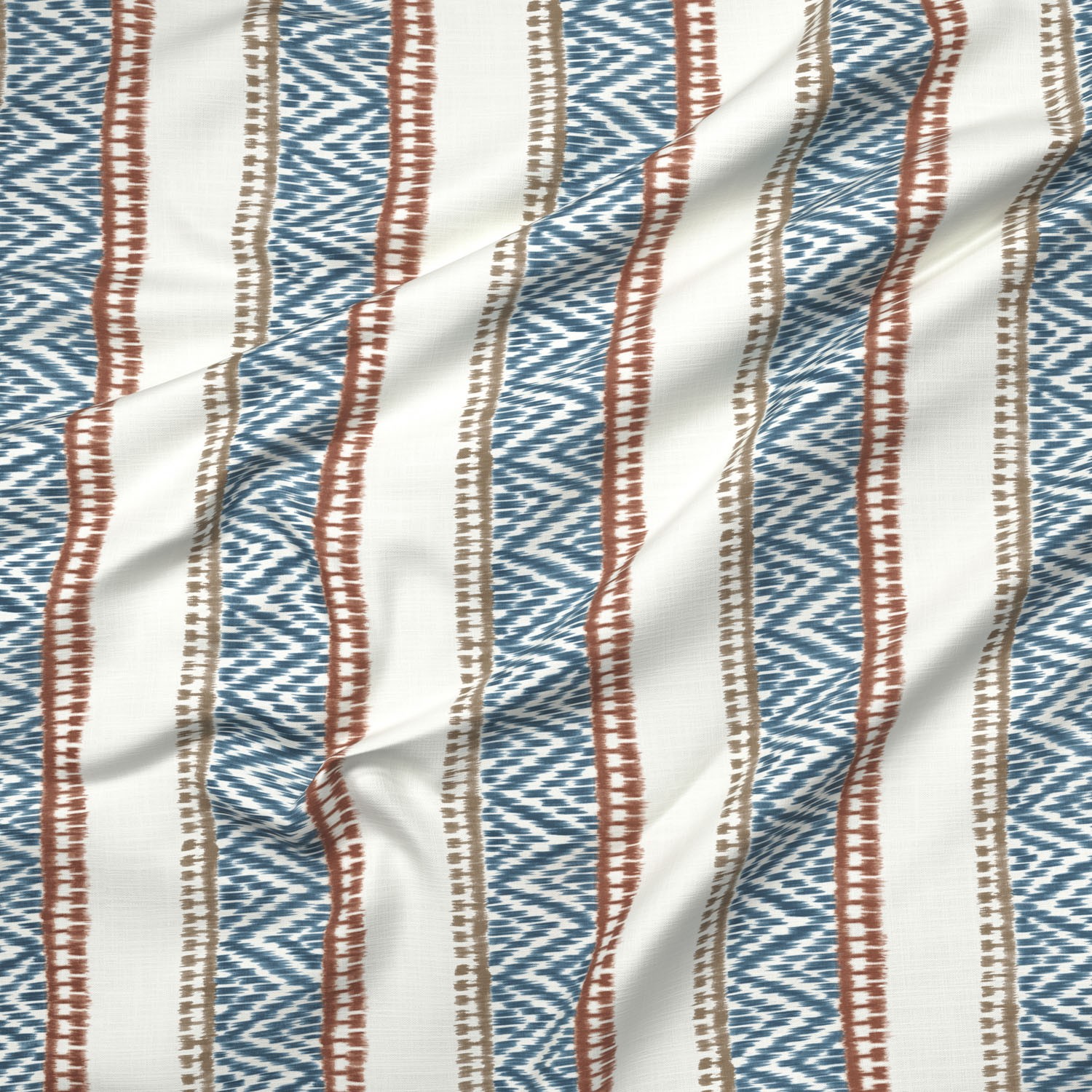 A Persian inspired decorative stripe shown here in an inky blue with earthy red and taupe accents. Printed on a beautifully soft 100% organic cotton, this intricate zig zag fabric design was taken from an ancient rug border and has been reworked in five contemporary colourways.