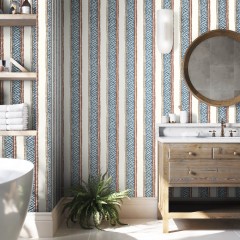 A Persian-inspired decorative stripe shown here in an inky blue with earthy red and taupe accents. This intricate zigzag wallpaper design was taken from an ancient rug border and has been reworked in five contemporary colourways.