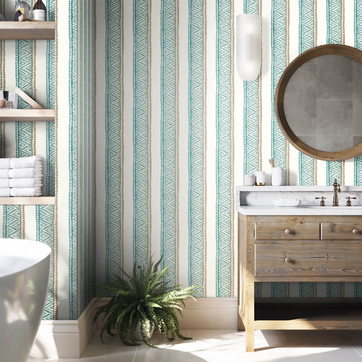 A Persian-inspired decorative stripe shown here in teal blue and taupe hues. This intricate zigzag wallpaper design was taken from an ancient rug border and has been reworked in five contemporary colourways.