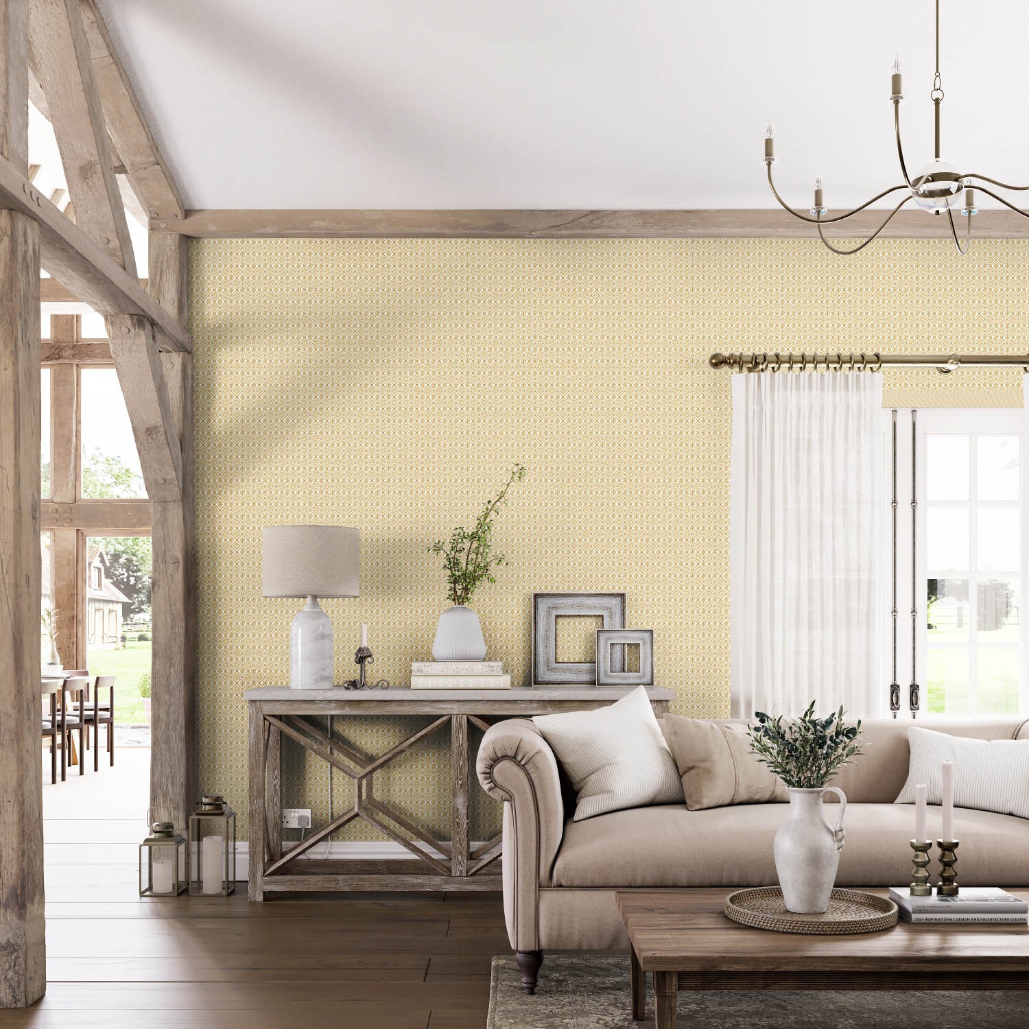 Created in our studio, this hand block style floral trellis takes inspiration from an 18th century Indian plate. Featured here in a striking golden yellow, this usable wallpaper design is available in nine other colourways.