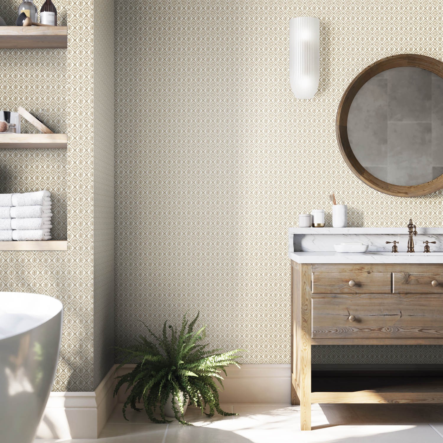 Created in our studio, this hand block style floral trellis takes inspiration from an 18th century Indian plate. Featured here in a warm neutral shade, this usable wallpaper design is available in nine other colourways.