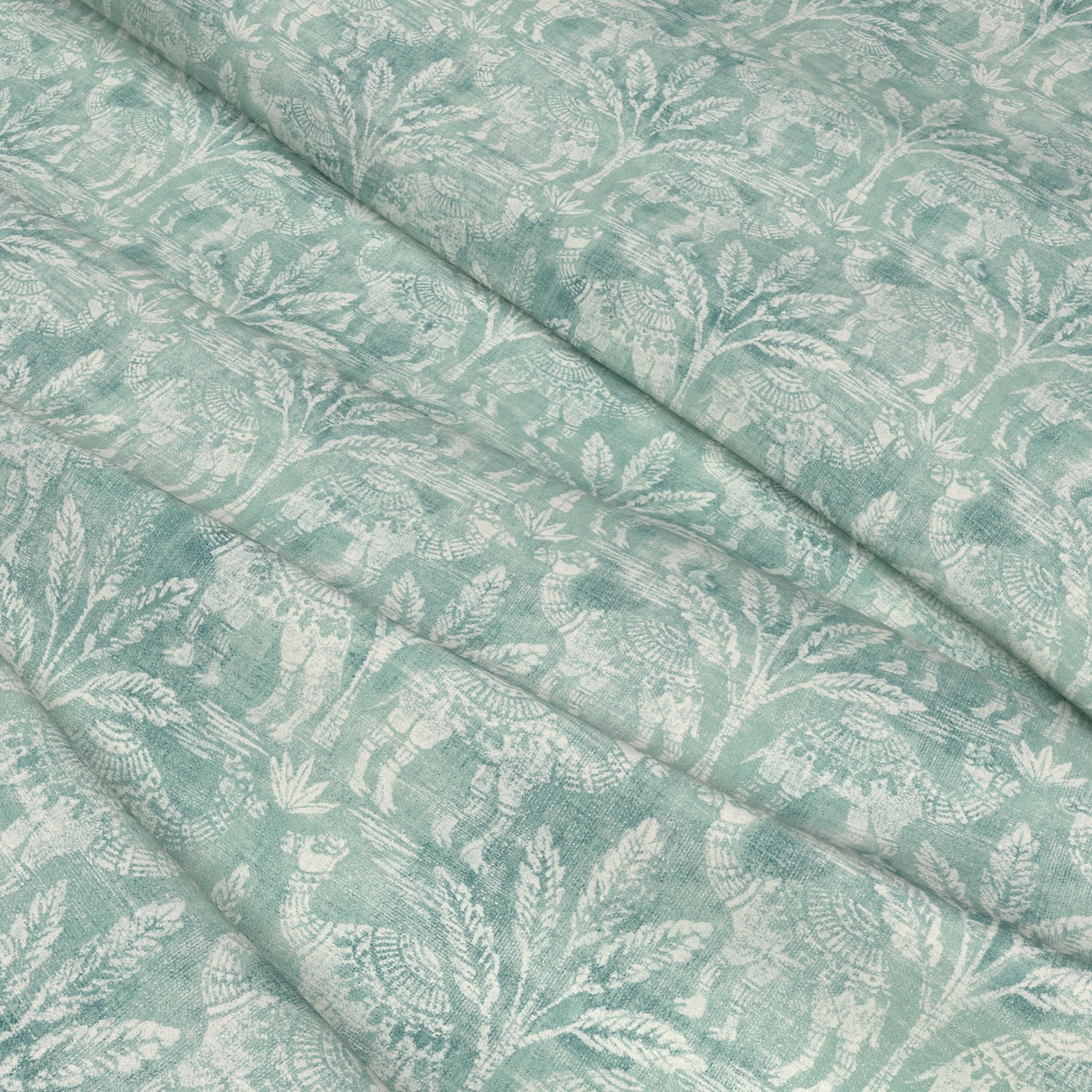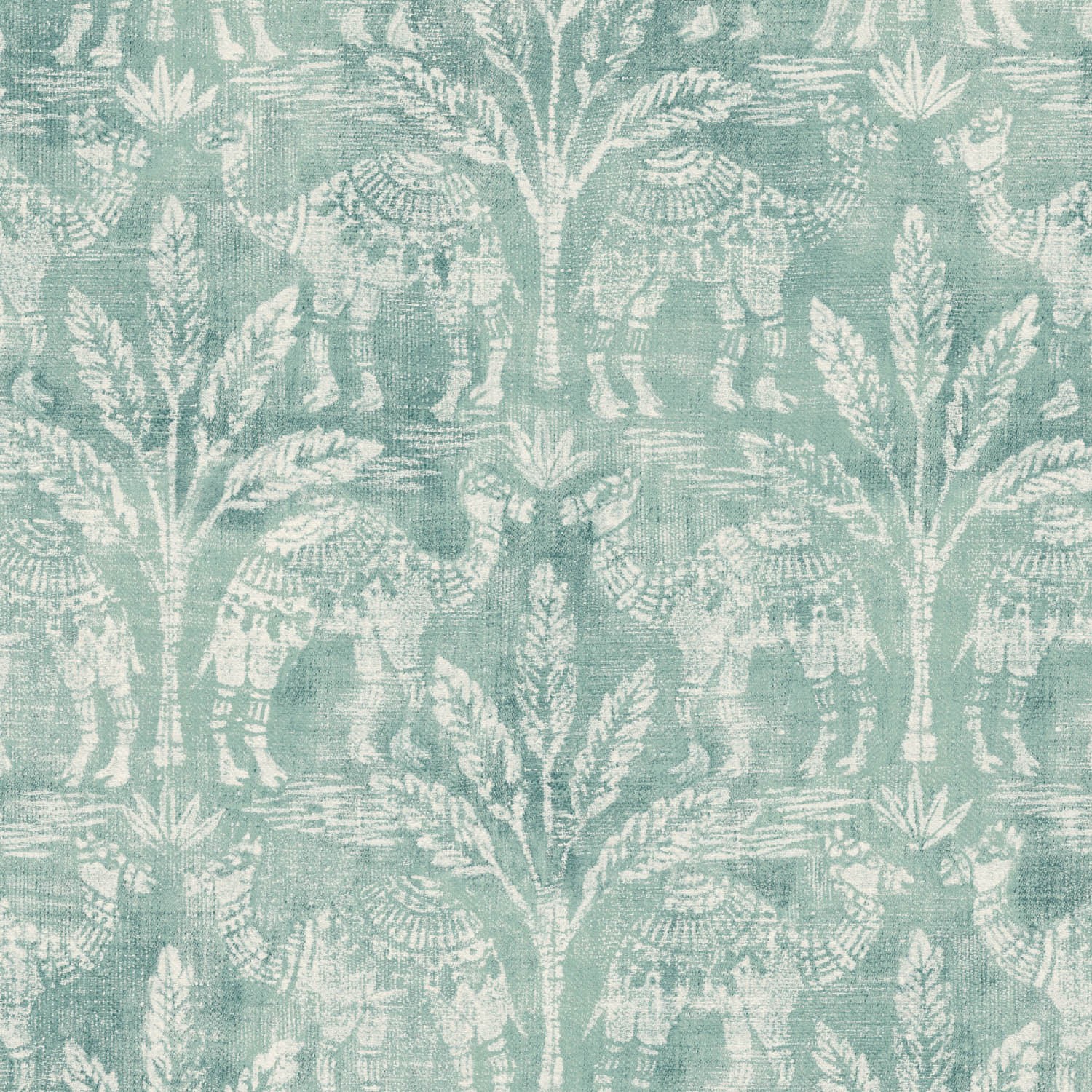 A desert oasis of camels and palm trees await in this exotic textural fabric, produced from 100% recycled cotton. With hand painted effects in an irregular, tonal style, this alluring fabric comes in five stylish colourways including this teal green.