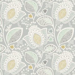 An Indian floral design, with a contemporary take, featuring stylised leaves and generous blooms trailing across a grey ground. Smaller decorative buds in soft gold shades and aqua add delicate detail to this 100% recycled cotton fabric.