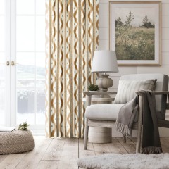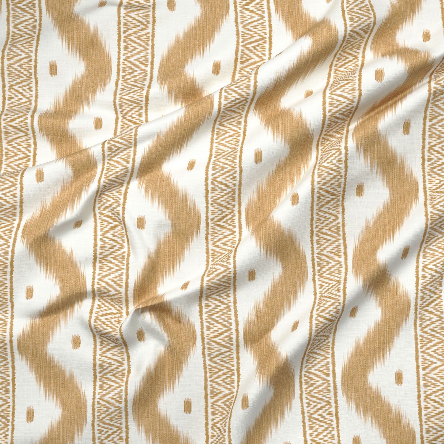 Shown here in its warming ochre colourway, this chic ikat style design features an ogee stripe with sweeping decorative inner detail. This confident print is an ideal scale for drapery, printed on 100% organic cotton for a beautifully soft handle. Zena is printed in nine striking colourways.