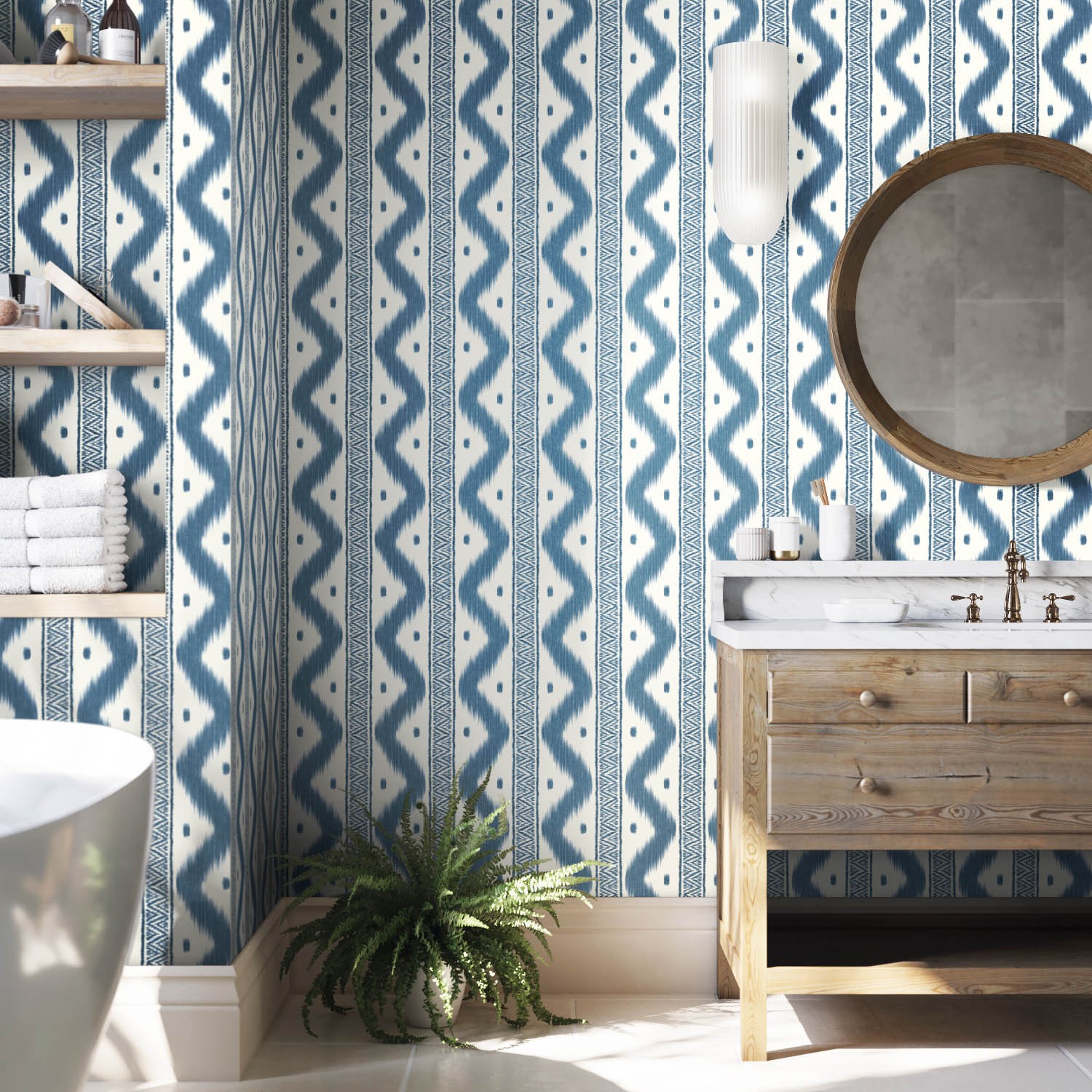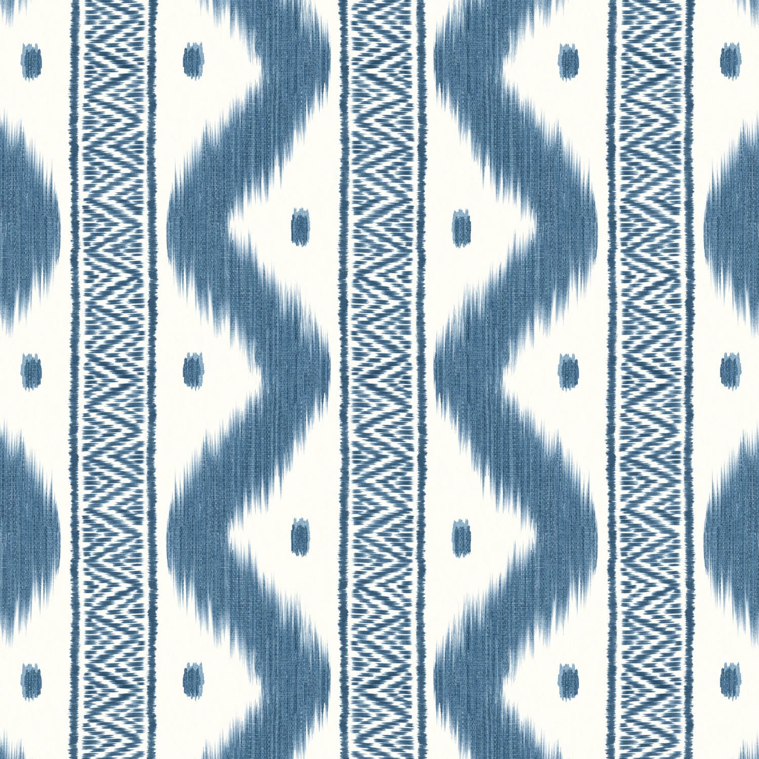Shown here in its deep ink blue colourway, this chic ikat style design features an ogee stripe with sweeping decorative inner detail. This confident print is perfect for making a statement on your walls. Zena is printed in nine striking colourways.